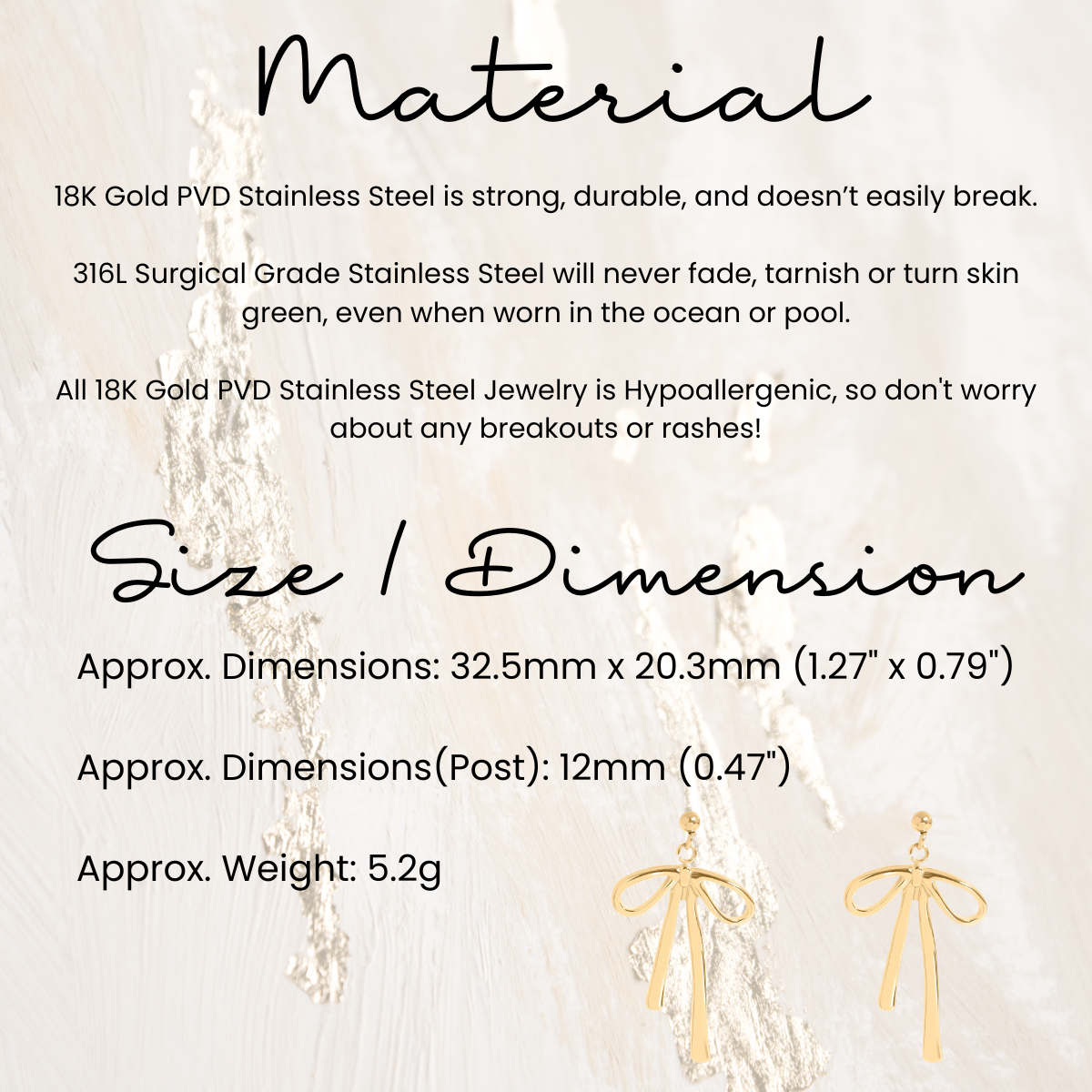 These Ribbon Bow Earrings bring timeless charm with a modern edge. Crafted from durable stainless steel and coated in luxurious 18K gold using advanced PVD technology, they offer long-lasting shine and resistance to tarnish and wear.